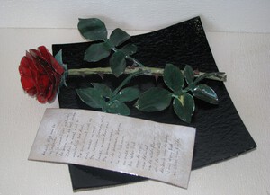 2023Geemaileerde roos en brief op glazen schaal.